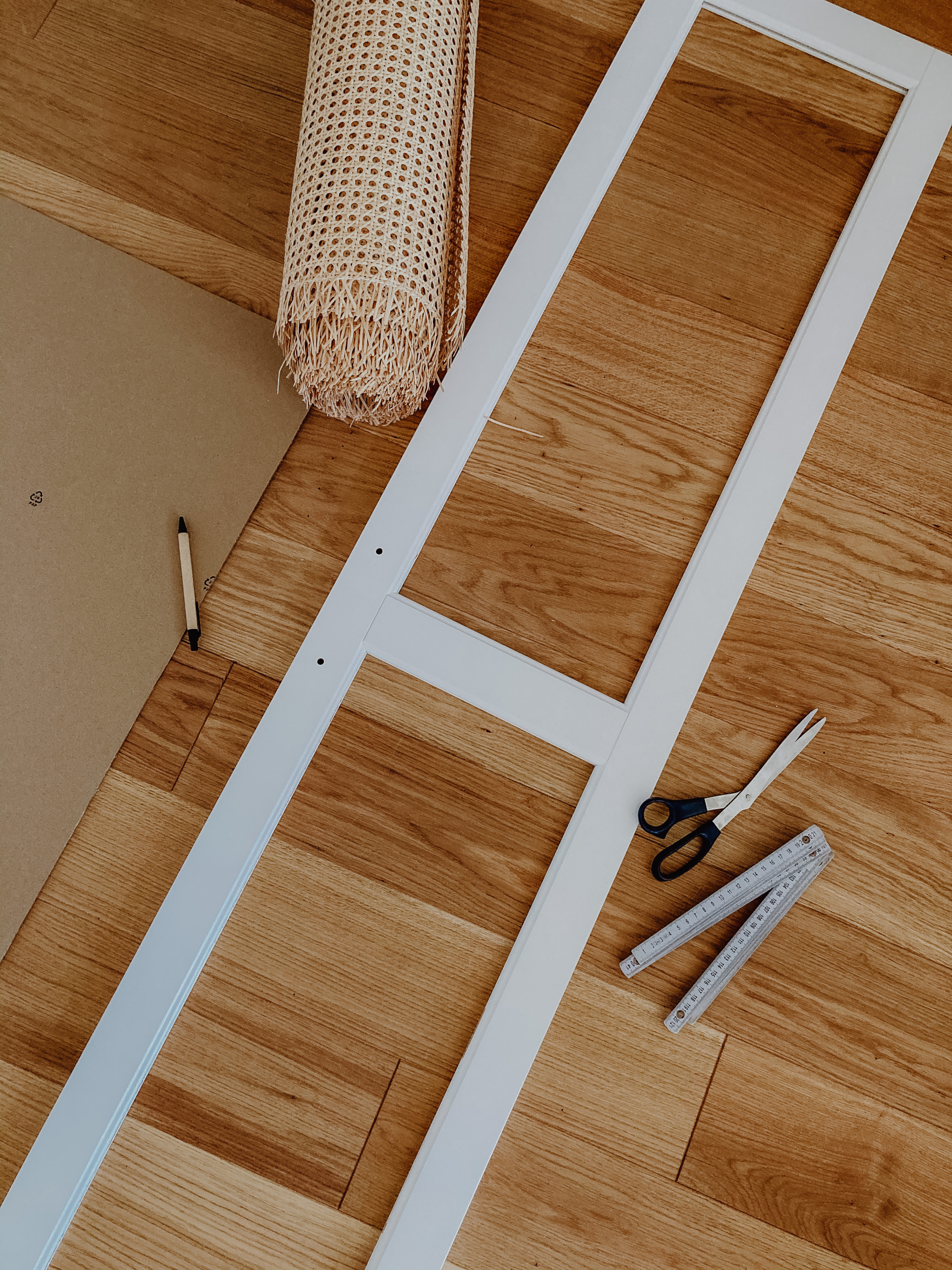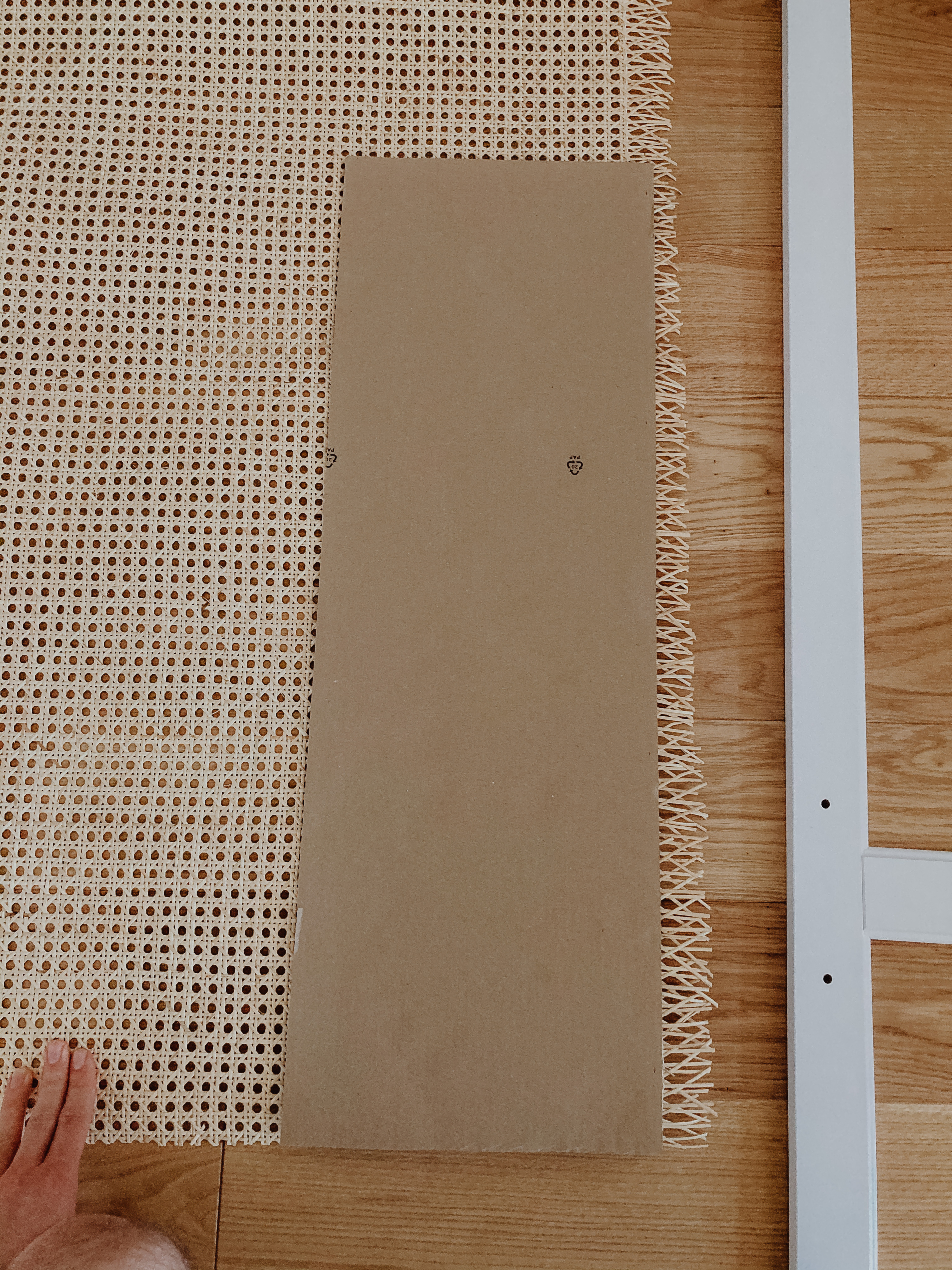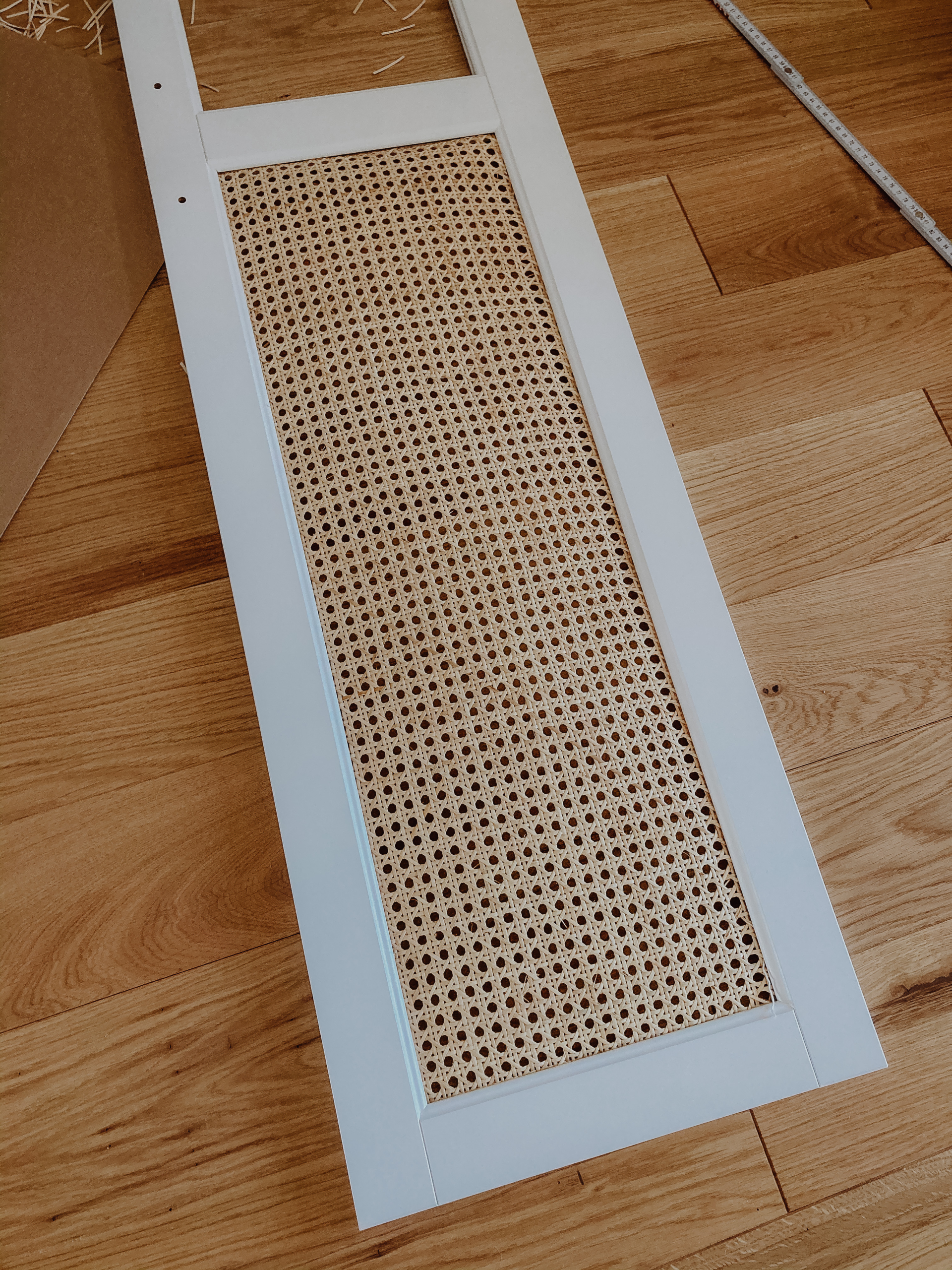 Im nächsten Schritt kommt das Wiener Geflecht zum Einsatz. Wir haben dieses hier benutzt: https://amzn.to/36hClms und können es für diese Verwendung absolut empfehlen, da es sehr stabil ist. Um das Geflecht auf die richtigen Maße zuzuschneiden, haben wir uns zuerst eine Schablone aus Pappe gebastelt. Die Kerbe, die sich innerhalb des Rahmens ergibt, ist etwa 9 mm tief. So kamen wir für die Schablone der Schranktürenausschnitte auf eine Breite von 27,2 cm und eine Höhe von 80,5 cm. Bevor man mit dem Zuschneiden des Geflechts beginnt, kann man mithilfe der Schablone nochmal überprüfen, ob die Maße so passen werden.