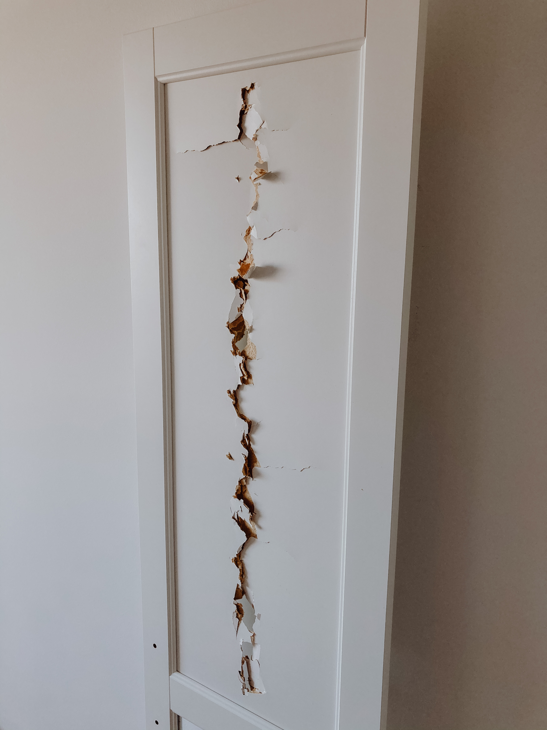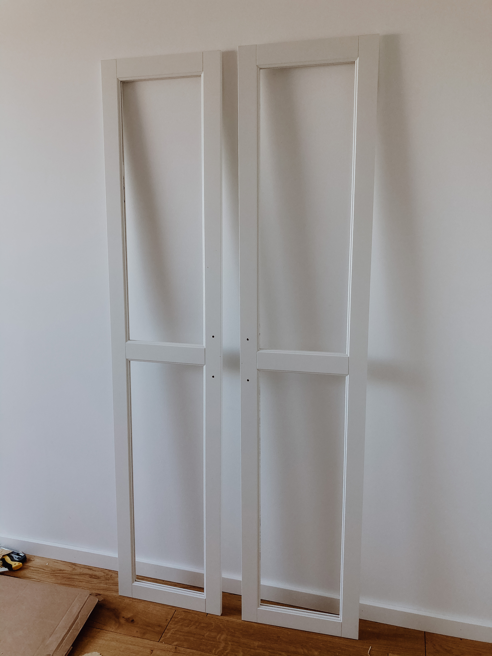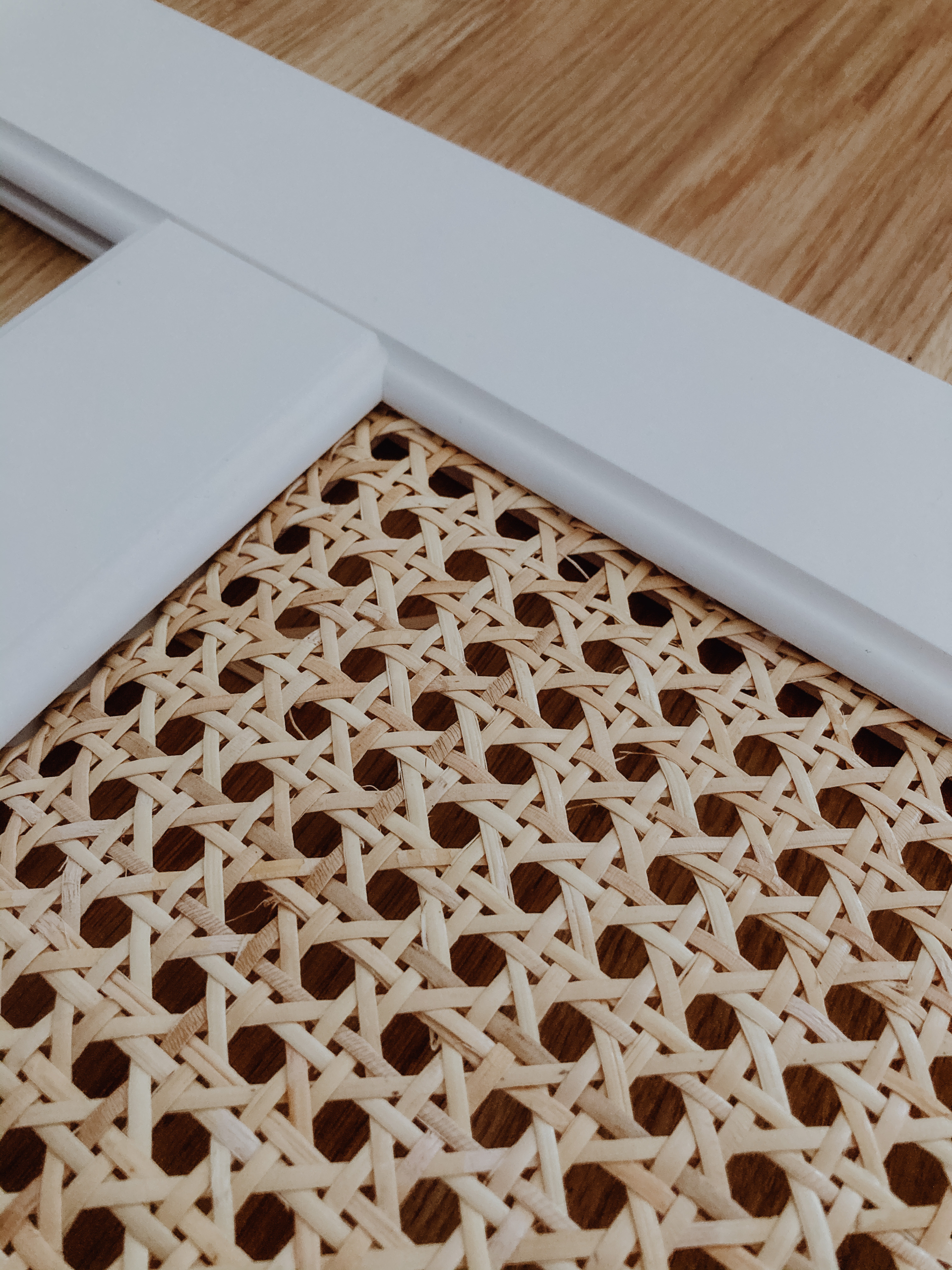 Im nächsten Schritt kommt das Wiener Geflecht zum Einsatz. Wir haben dieses hier benutzt: https://amzn.to/36hClms und können es für diese Verwendung absolut empfehlen, da es sehr stabil ist. Um das Geflecht auf die richtigen Maße zuzuschneiden, haben wir uns zuerst eine Schablone aus Pappe gebastelt. Die Kerbe, die sich innerhalb des Rahmens ergibt, ist etwa 9 mm tief. So kamen wir für die Schablone der Schranktürenausschnitte auf eine Breite von 27,2 cm und eine Höhe von 80,5 cm. Bevor man mit dem Zuschneiden des Geflechts beginnt, kann man mithilfe der Schablone nochmal überprüfen, ob die Maße so passen werden.