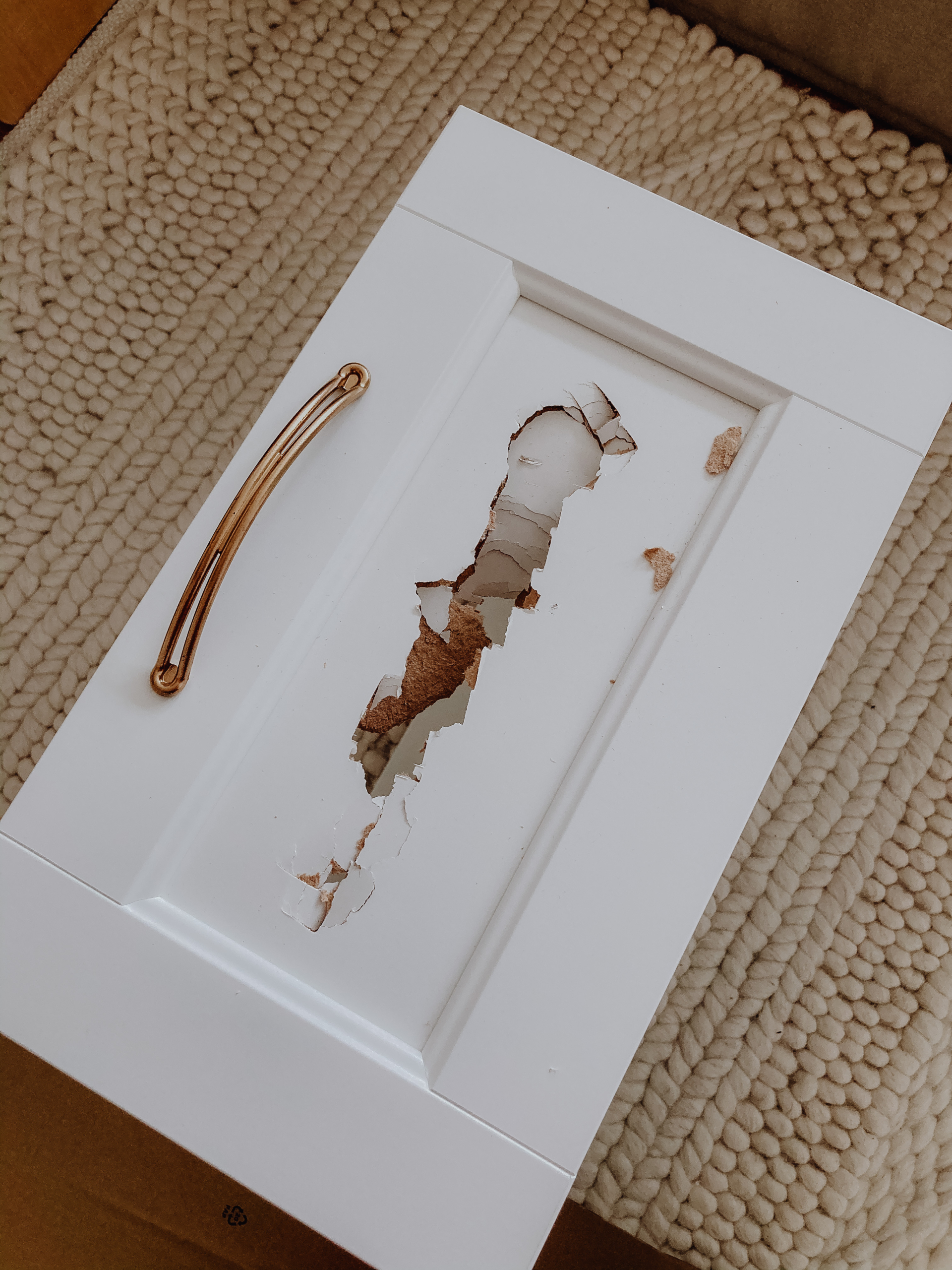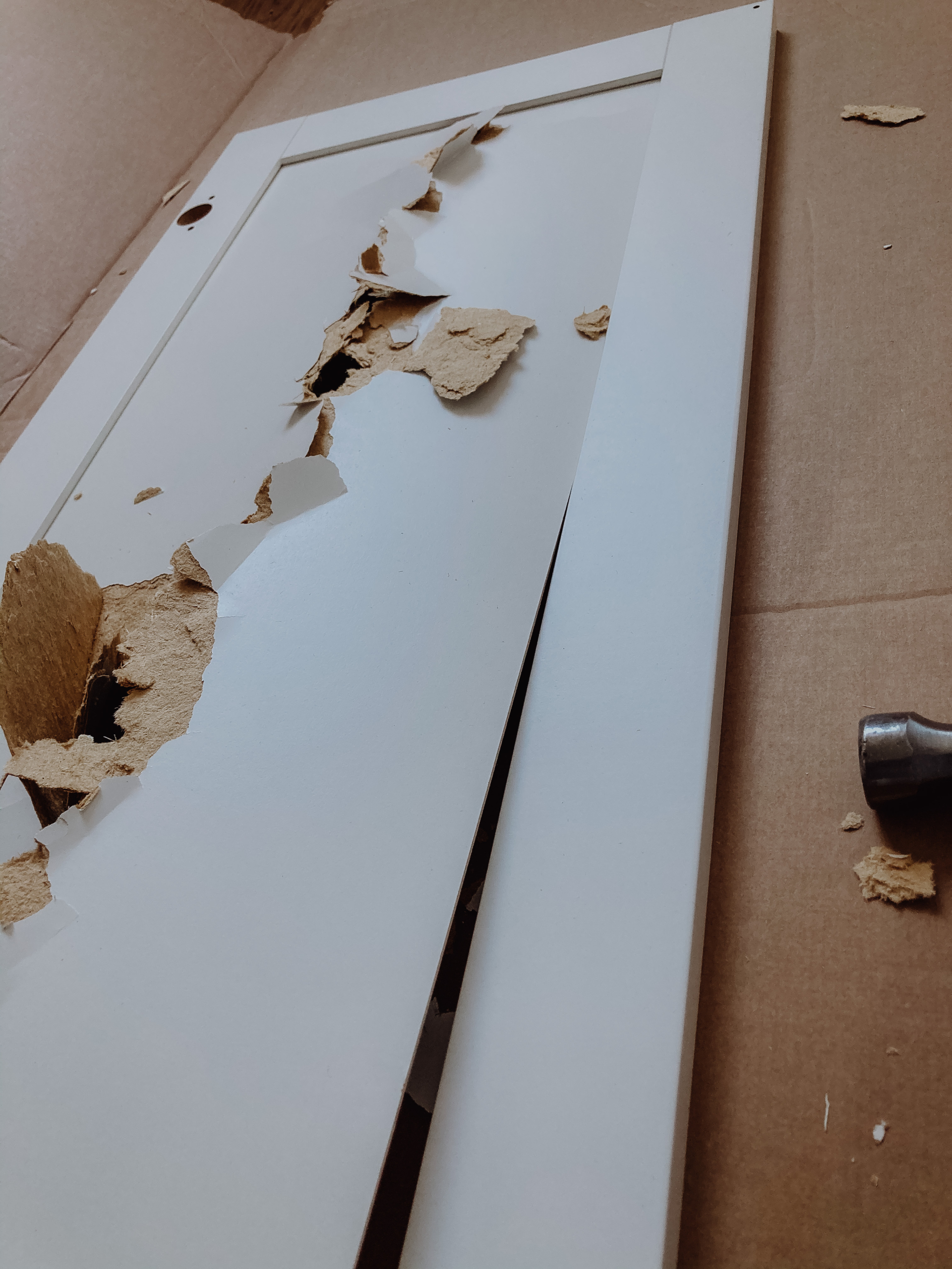 Die Fronten dieser Möbelreihe bestehen aus jeweils gerahmten Pressspahnplatten, die im ersten Schritt mit roher Gewalt aus dem Rahmen gebrochen werden müssen. Dazu haben wir mit der spitzen Rückseite eines Hammers eines Riss in die Mitte geschlagen und dann die Einzelteile aus dem Rahmen gezogen. Dabei ist es wichtig, dass die Kerben, in die die Frontplatten eingelassen sind, nicht beschädigt werden, da in diese später das Geflecht gesteckt werden soll.