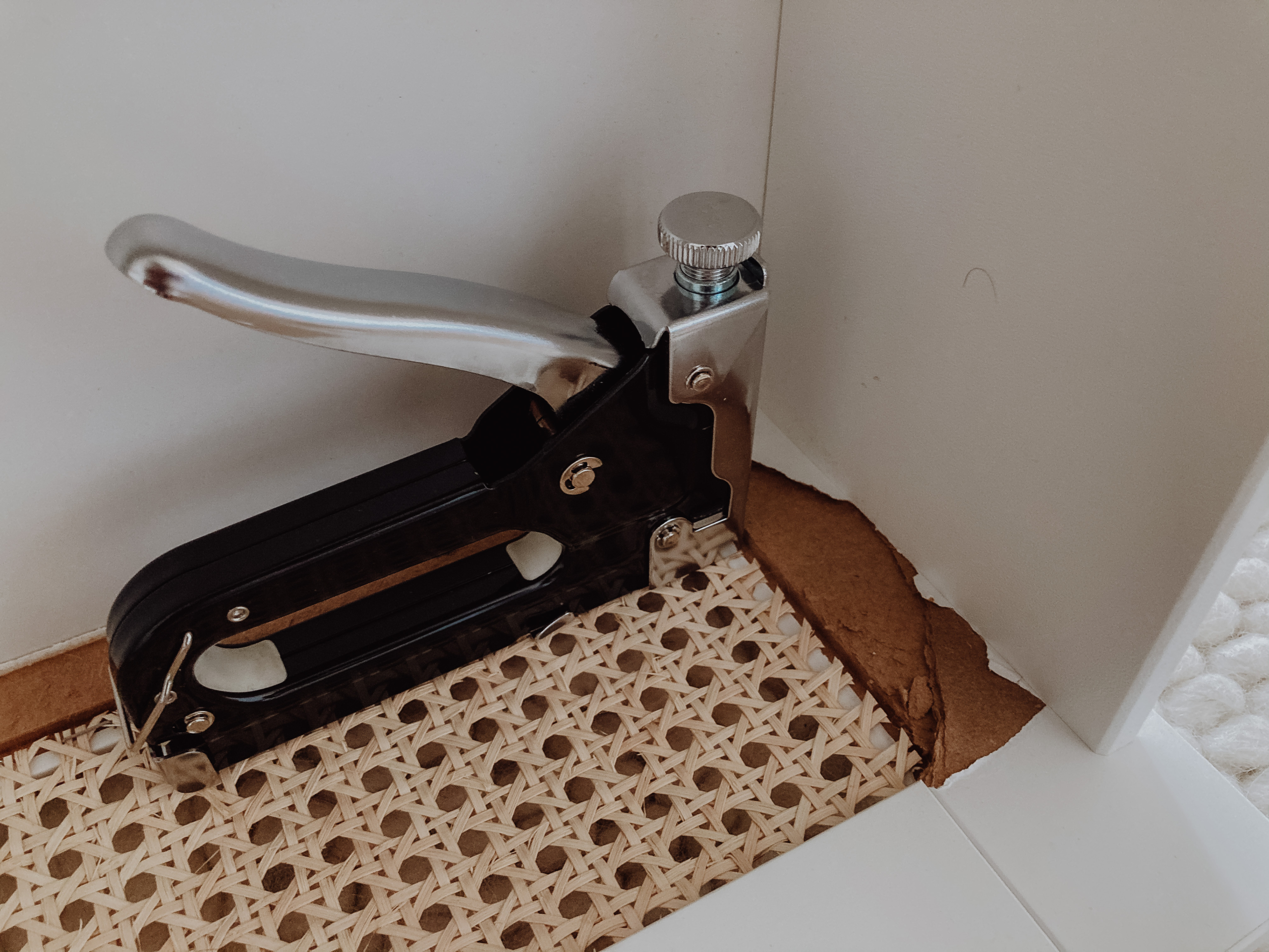 Da es uns bei den Schubladen so gut wie gar nicht gelungen ist, den innenliegenden Rahmen zu erhalten, haben wir das Geflecht einfach von Innen festgetackert. Sieht ja keiner. Deswegen kann ich euch für die Schübe auch keine Schablonenmaße geben, da wir diese immer individuell ausgemessen haben.
