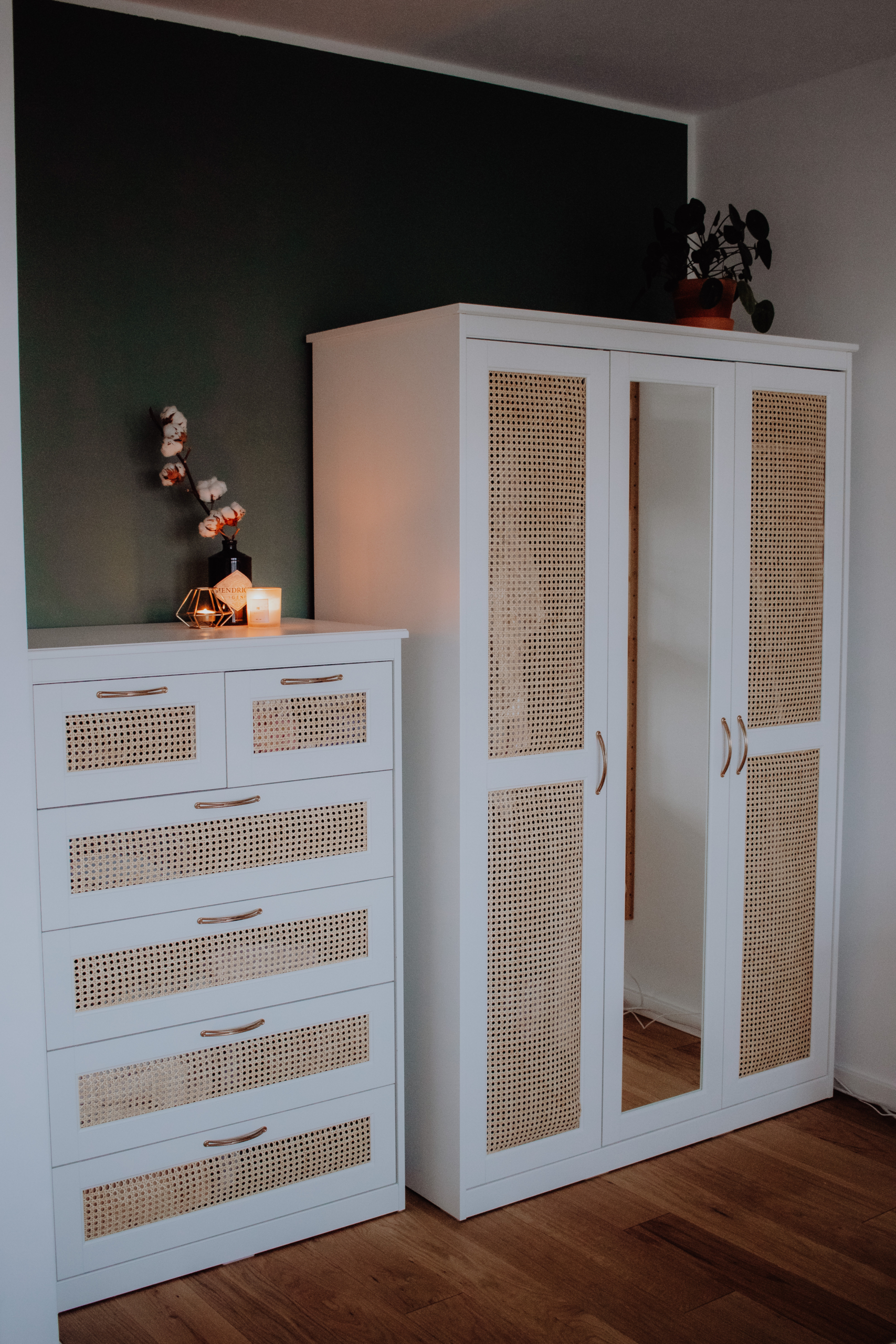 Auf die Idee sind wir gekommen, da wir unser neues Schlafzimmer gern etwas mehr im „Boho“-Stil und daher gern eine Kleiderlösung mit Wiener Geflecht haben wollten. Es gab auch Kleiderschränke und Kommoden, die unseren Geschmack trafen, die waren uns aber immer deutlich zu teuer. Also haben wir diese beiden verhältnismäßig günstigen Möbel als Grundlage für unser kleines DIY-Projekt gekauft: